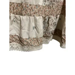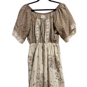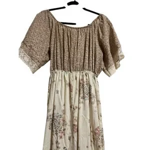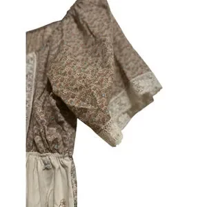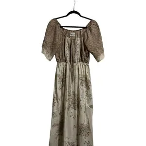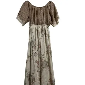 This pre-owned women's maxi dress features a beige and brown floral pattern. The top portion has a brown background with small floral prints and short, elasticized sleeves with lace trim. The bodice includes a central lace panel and a drawstring at the waist. The skirt is a lighter beige with larger floral motifs and a ruffled hem with lace detailing. The dress appears to be made of a lightweight fabric.