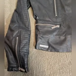 Sleek black leather biker jacket with asymmetrical zip front. Quilted sleeve panels add edgy texture. Multiple zip pockets and silver-tone hardware for functional style. Tailored cut for a contemporary silhouette.