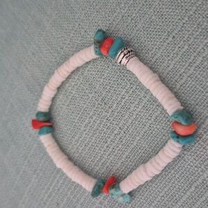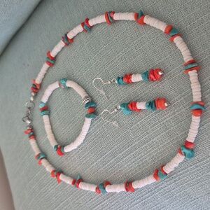 19" Necklace, White Shell Rings,Turquoise & Coral Chips.Braclet is matching 7 1/2" Earrings are 2".Necklace is strung on Stainless steel jewelry wire. Closures are Stainless steel non tarnish. Braclet is strung on heavy duty jewelry cord. Earrings are Sterling Silver. NATURAL SHELL,TURQUOISE,CORAL