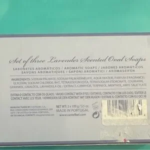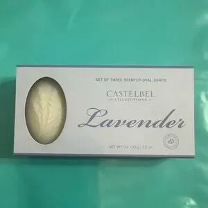 Castelbel Ltd. Editions Lavender Soap Set, which includes three scented oval bars of soap. This luxury gift set is made in Portugal and features a classic, relaxing lavender fragrance.