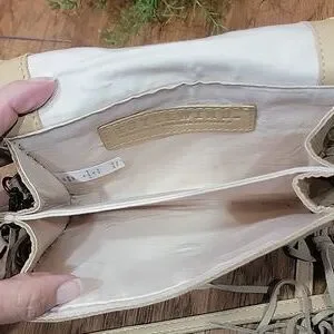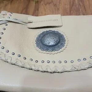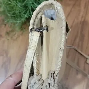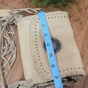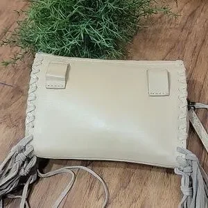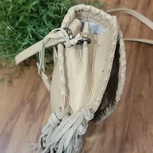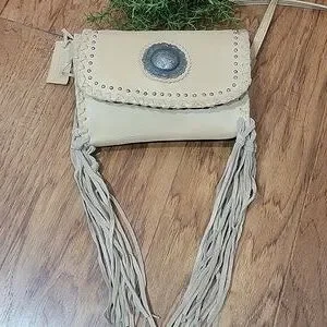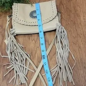 Rugged, yet soft pebble leather crossbody bag with dancing fringe and a concho cabochon. Can convert to a belt bag. Casual, Western-inspired look. In excellent clean preloved condition. Please see the measurements in the photos. Long adjustable strap.