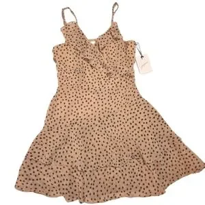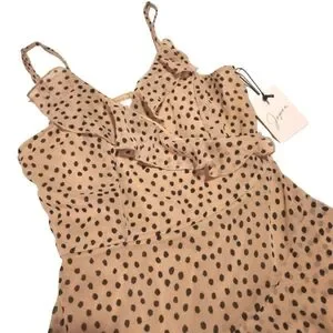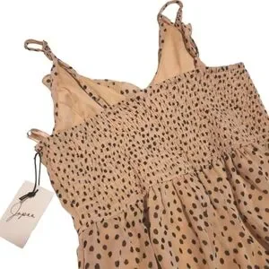 NWT, Japna tan/cream colored dress romper with black polka dots size Medium. With a silky underlining, adjustable straps, smocked back, 100% polyester made in India. A cute summer party outfit.