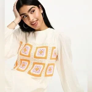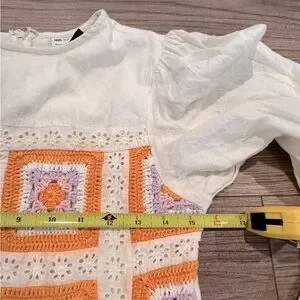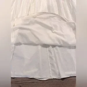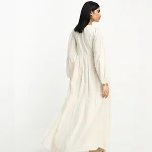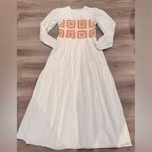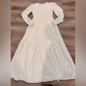 Excellent like new condition. Elegant cream maxi dress with crochet bodice detailing and long puff sleeves. Perfect for a bohemian look. Fully lined.