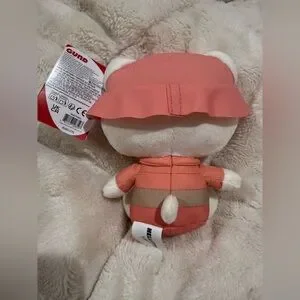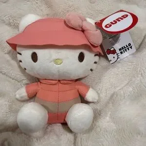 Adorable Hello Kitty plush wearing a coral pink hat and outfit. Cream face, limbs, and accents. Embroidered facial features and bow detail. Soft, collectible stuffed animal with GUND tag.