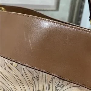Beautiful Ferragamo shoulder bag. Interior has three sections, including a zipper section lined in beautiful gold leather. Some marks on the leather trim and a small stain on the exterior fabric.