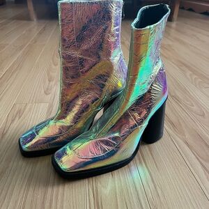 Step out in style with these stunning holographic ankle boots. Featuring a vibrant iridescent color, these shoes are perfect for making a bold fashion statement. Minor scuffs from wearing once. Size 38!
