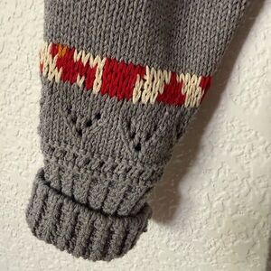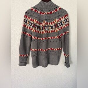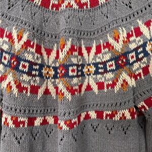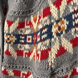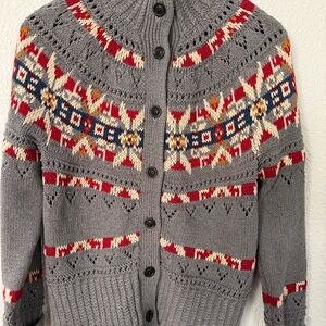 Shawl-collar cardigan with full button front. Gray base sweater with Fair Isle yoke and stripe details. Soft knit construction for everyday warmth. Red, navy, cream, and tan accents create a classic look. Additional button enclosed on tag (see pictures) 100% cotton.