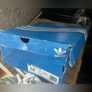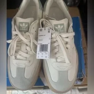Classic Adidas Samba sneakers. White leather with gray accents. Comfortable and stylish.