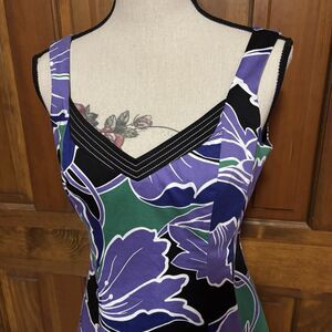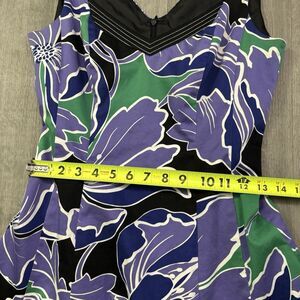The Nine West Purple Green Floral Dress in size 4 is a stylish and colorful option for various occasions such as parties, weddings, or holidays. The sleeveless design with a v-neckline and floral pattern exudes a feminine and Barbie-like charm. Made from cotton with a canvas fabric type, this knee-length dress features a zip closure and is perfect for all seasons including winter, spring, summer, and fall. The multicolor palette and fit & flare style make this dress a versatile choice for any fashion-forward woman.