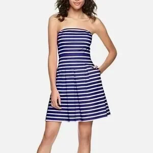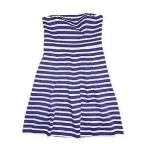Chic and stylish, this navy and white striped strapless dress is perfect for any occasion. The classic design offers a flattering fit and timeless appeal.