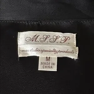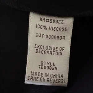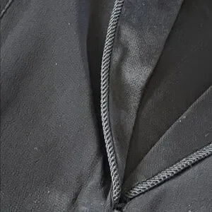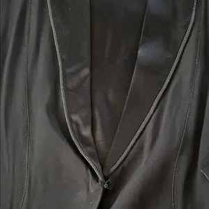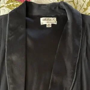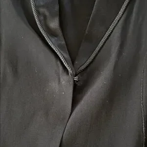 Lightweight black blazer with satin-trim shawl collar for polished layering. Features front patch pockets and a relaxed, draped fit for everyday and evening wear. Versatile black color pairs easily with tailored or casual looks. It feels like satin trim and trimmed out in a nice cording. No stains no rips.