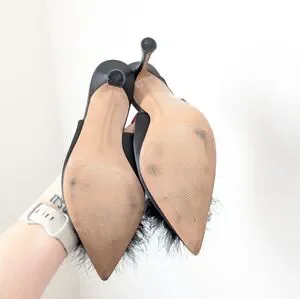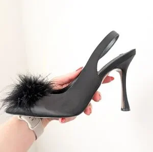Steve Madden Black Feather Pom Pom Blythe Satin Slingback Heels Pumps
