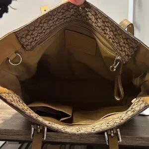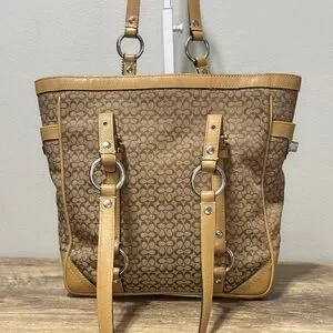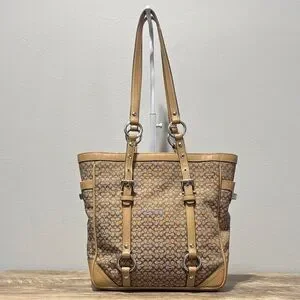 Coach F11526 signature gallery tote with signature pattern and leather trim. Features khaki mini-signature jacquard with tan/light brown leather trim. Good pre-loved condition, does show signs of wear. (See photos for details) clean, smoke free home.