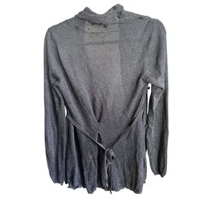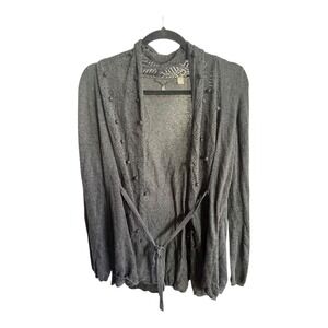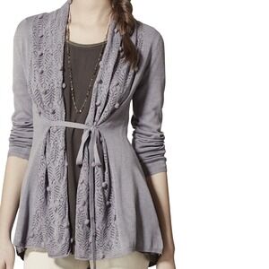 Anthropologie Knitted & Knotted Gray Pom Cardigan Sweater M in EUC. Tie Waist Cute Pom Pom details. Some open knit around the trim. Tie in front or back. Detailed and bohemian casual. 55% Cotton, 20% modal, 20% polyester, 5% silk