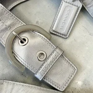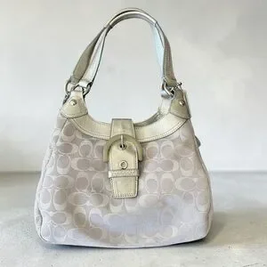 Coach shoulder bag with signature jacquard logo. Soft grey/lilac fabric with silver leather trim and buckle accent. Comfortable double handles for easy wear. Neutral tones pair well with many outfits.
