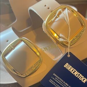 Elegant Birkenstock sandals with striking gold buckles. Ideal for everyday comfort.