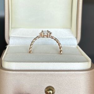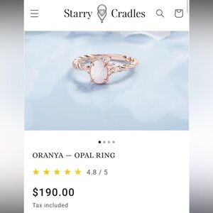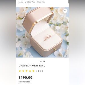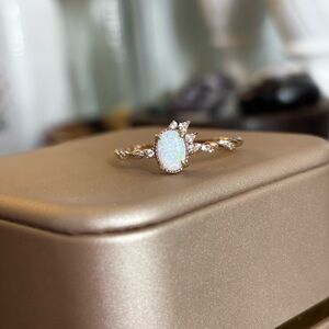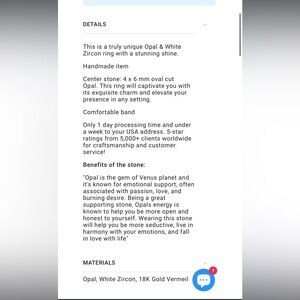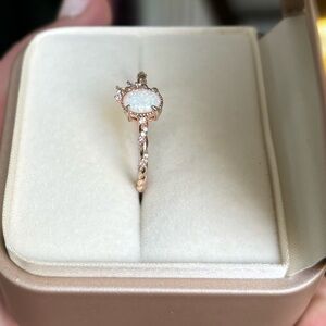 This ring features white zircon & a stunning opal set in a rose gold vermeil band. I included pics of where I got it and their description on the site. It will come with its original box. I had it packed away the last couple years and took it out to see it’s a bit tarnished where the prongs are around the opal. The rose gold shine is just a bit faded in those areas. I tried to get pics of all angles and in different lighting.