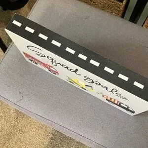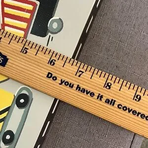 Playful wall sign featuring three construction vehicles. Bright colors and fun lettering. Easy to hang in a child's room. Cheerful and modern design.