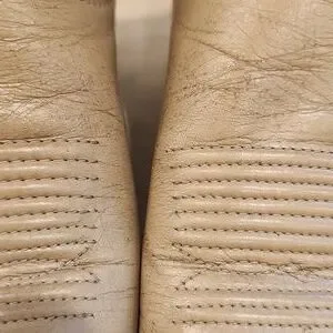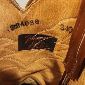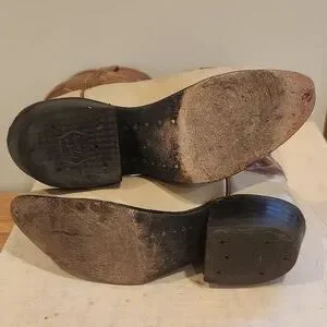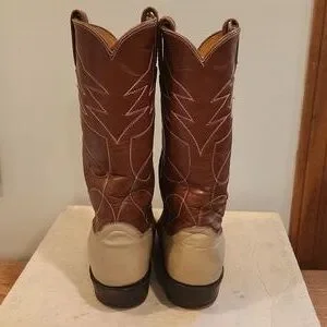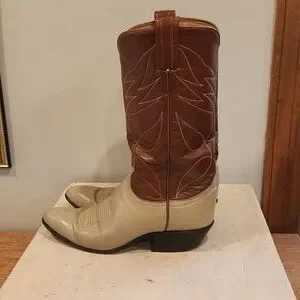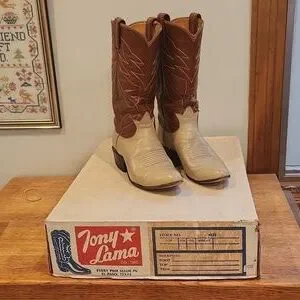 Vtg 1970s Tony Lama Women's Leather Cowboy Boots Brown and Taupe Sz 5. Almond toes. Good Vintage condition. The only real flaws are light scuffs on the toes and very mild cracking in the patina of the uppers in a couple of places as shown. The brown leather of the shafts are excellent condition. Feather stitching on shafts. I am unable to find a size in the boots, however, this came from a collection I purchased and all of the boots were size 4.5 or 5. Please review measurements. The boots are in their original box marked $99.99.