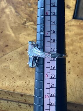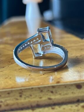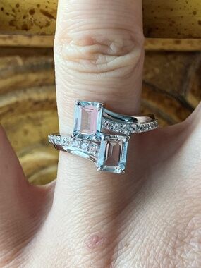 This beautiful ring is made with all real, earth mined gemstones including aquamarine and white zircon. The total gemstone carat weight on the ring is 1.84. The ring is set in solid .925 sterling silver with a rhodium plate to prevent tarnishing. The ring in the photos is the actual one you will receive, so please see photos for quality and measurements. The aquamarine is tested in the photos for verification. Size 8.