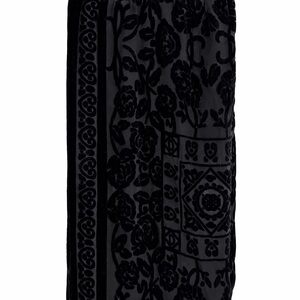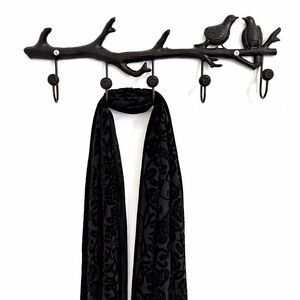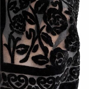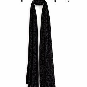 Elegant black sheer scarf featuring velvet floral burnout detailing. A romantic soft gothic inspired piece with ornate floral panels and a delicate sheer base. The design carries a subtle dark floral mood while remaining refined and wearable. Lightweight with beautiful drape, perfect for layering over dresses, blouses, knits, or evening wear for a feminine statement. Can be styled as a scarf or worn as a light shawl.