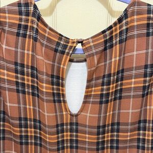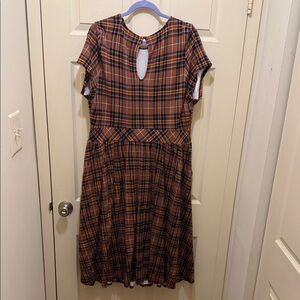 Torrid dress in brown plaid with contrasting stripes. Short sleeves and a scooped neckline. Fitted waist with a full, flared skirt. Classic plaid for everyday wear.