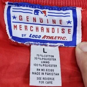 Interior and tags: MLB Genuine Merchandise by Logo Athletic neck label and attached fabric tag with size L, fiber content, and care information.