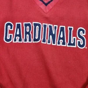 Front design: V-neckline with striped rib knit trim and large raised CARDINALS applique lettering across the chest in navy with white borders.