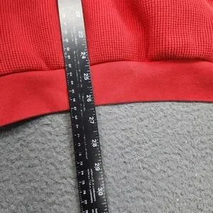 Side and back details: Long sleeves with rib knit cuffs, a stretch ribbed waistband, and a plain red back panel accented by a small embroidered Logo Athletic emblem below the back neckline.