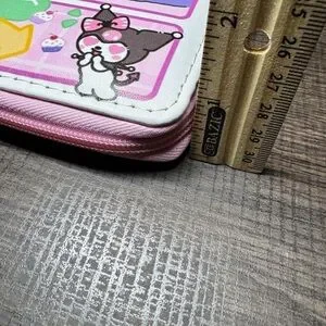 Cute Kuromi wallet with playful design. Features pink and white colors. Perfect for fans of adorable characters. Brand New wallet. Measures approximately 7 1/2 inches by 4 inches in width. Has three compartments, with slots for 12 card slots, a zippered coin, and an area for bills.
