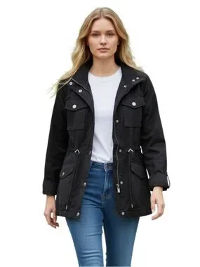 Chic dark utility jacket. Includes multiple pockets. Ideal for everyday style.