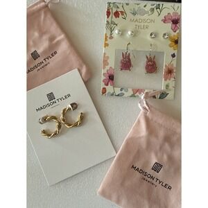 Four pairs of earrings! Ready for Spring! One pair of twisted gold post hoops, FUN Pink Easter Bunny Rabbits Hooks, Pearl and Rhinestones post earrings