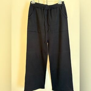 Black sweater pants w covered elastic waist and patch pockets complete the set.