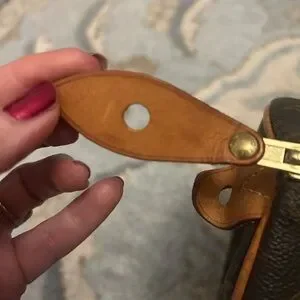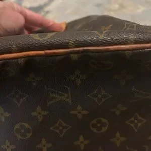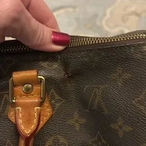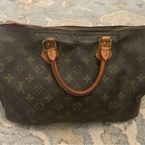 Louis Vuitton Speedy 40 satchel in signature monogram canvas. Tan leather handles and trim. Gold-tone hardware accents. Iconic LV pattern for timeless style. I have taken photos of two places where the canvas is cracked and some wear on the leather trim. Handles were replaced 3 years ago at 400 per handle. I do have a shoulder strap also. Extra 50.00. Price reflect the 2 canvas tears shown in photo .There are also some pin marks on inside.