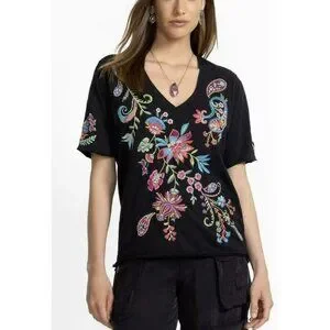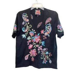 Johnny Was Black V-Neck Floral Embroidered T-Shirt Size Small New