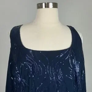 Keywords: Alex Evenings, Navy Blue, Sequined, Chiffon, A-Line, Midi, Overlay Bodice, Sleeveless, Scoop Neck, Plus Size, Wedding Guest, Mother of the Bride, Cocktail, Special Occasion, NWT, Size 24W.