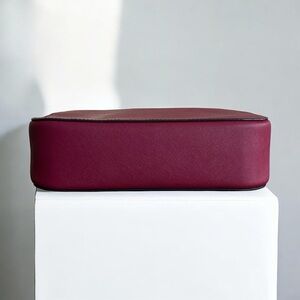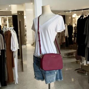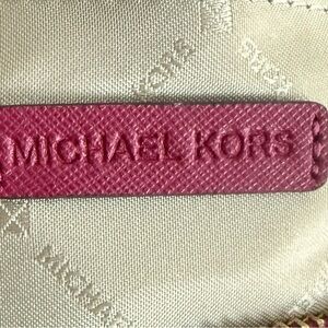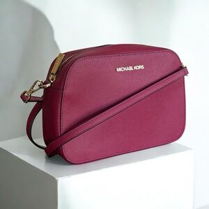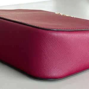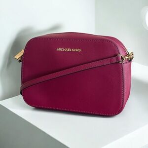 Sleek Michael Kors crossbody in vibrant magenta leather. Gold-tone logo and hardware accents with an adjustable crossbody strap and zip top closure. Clean silhouette for day or night. Measures approximately 9”w x 6”h x 3”d