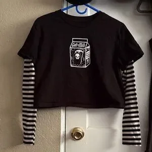 Black cropped tee with attached black-and-white striped long sleeves. Front white Goth-Milk carton graphic with skull detail. Edgy layered look that's easy to pair with casual bottoms.