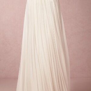 This 3 piece, ivory wedding dress features intricate embellishments on a delicate white fabric, providing romantic shimmer for you on your special evening. The timeless look will make you feel beautiful and confident. The light flutter sleeves bring extra femininity. The fact that it’s 3 pieces made it so comfortable and moved with me well. I did the ceremony in a lace topper and changed to this beaded topper for reception. I do intend to list the lace topper and satin trim veil as well. The pieces all came together perfectly. Through the hugs, dancing, photos, and lifting babies, this dress had me shining all evening. I am 5’2” and 120 lbs. I wore 3.5 in heels which did show at the bottom. I did not want the hem to drag because there would be quite a few youngsters dancing around. You can try a 2 inch heel or flats if you want the skirt to sweep the floor.