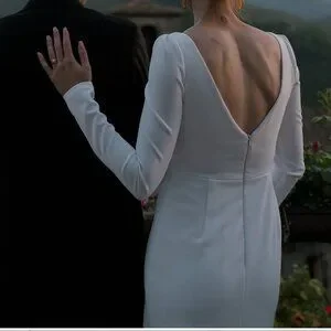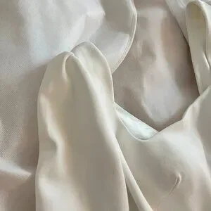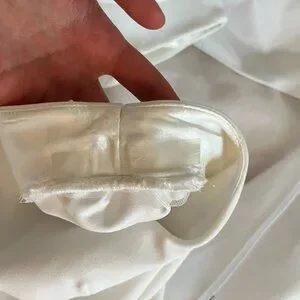 This dress was worn outdoors and the bottom needs to be cleaned. The remainder of the dress is excellent condition (Top, sleeves, etc.). There is sticky tape on the inside of the shoulder and chest area that I could not remove, so I left it. It is really unnoticeable or feel-able. I included an image of it!