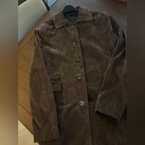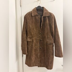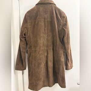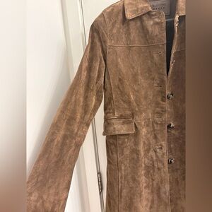 Elegant chocolate brown suede coat with a timeless button-front design. Soft suede fabric offers a refined look and comfortable feel. Tailored silhouette for versatile wear from day to evening. Clean lines and subtle details create a polished finish. Mid length Genuine leather Small stain on the front near buttons - see photos. I feel like I can’t see it often because it blends in with the look of the suede. Otherwise perfect condition, worn maybe 3 times. Garment Measurements (flat lay): Sleeve length - 23.5” Pit to pit - 19” Length - 34”