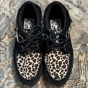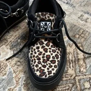 Bold T.U.K shoes with leopard pattern and black details.
