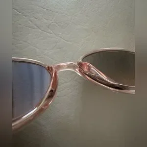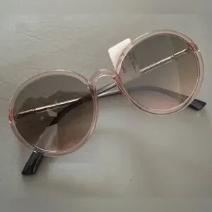 New. Never used. Pale pink acetate frames. Brown gradient lenses. Lens (eye) 55, bridge 20, temple 145. Made in Italy. These have been handled but no defects seen. No case. Original retail of $350.00.