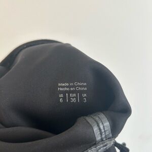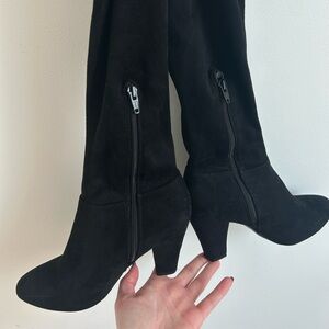 Over-the-knee design with a stacked block heel. Soft suede-like upper and rounded toe. Back tie detail for an adjustable fit. Sleek silhouette pairs with skirts or jeans.
