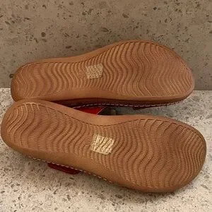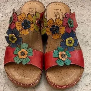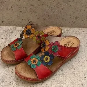 Step into style with L'Artiste's vibrant red floral sandals. Perfect for adding a pop of color to any outfit, these sandals feature colorful flower accents for a unique look. Top is adjustable for a tighter fit. They show almost no wear.