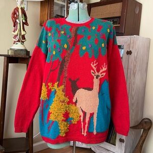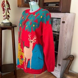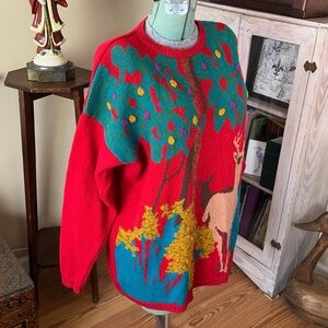 Vintage 90s Funky Nature Deer Colorful Textured Woodland Oversized Knit Sweater
