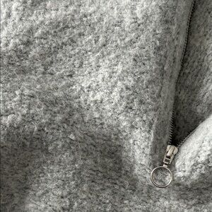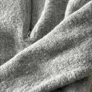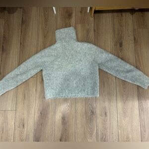 Cropped knit sweater with a half-zip turtleneck for adjustable coverage. Soft, fuzzy texture in a heather gray shade. Cozy, casual piece. Does have minor pilling throughout, see photos. There is no size on it, but it fits like a small.