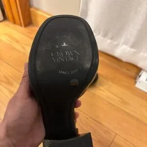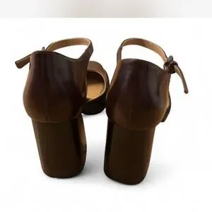 Stylish dark brown leather heels. Features a block heel and ankle strap. Perfect for any occasion.