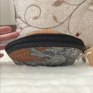 Unique John Erdos Gallery artisan makeup bag / wristlet pouch featuring a botanical-style print in warm earthy tones.