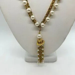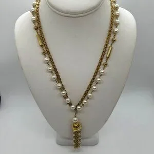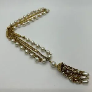 This vintage necklace features faux pearls, a gold-tone triple-strand chain, and a tassel pendant. An elegant piece for an elevated, timeless style.